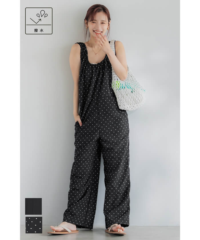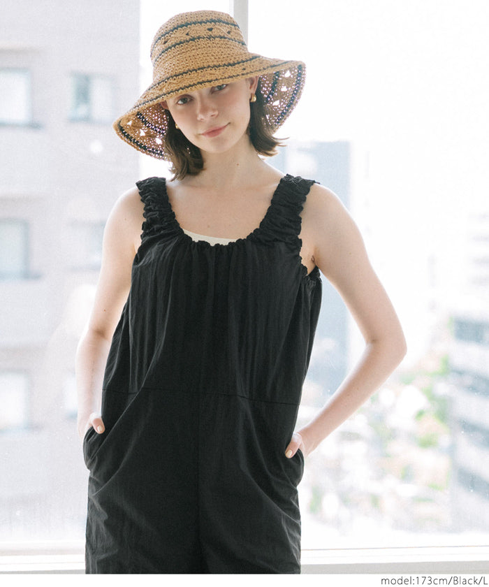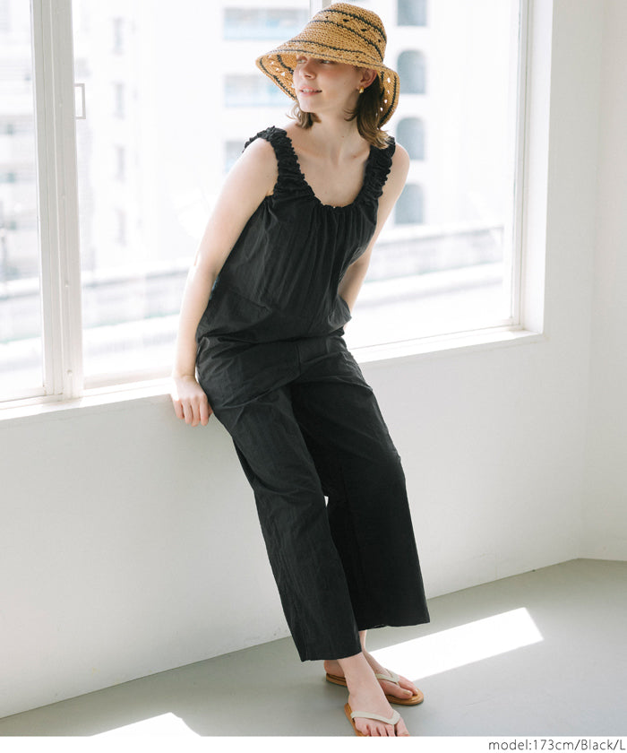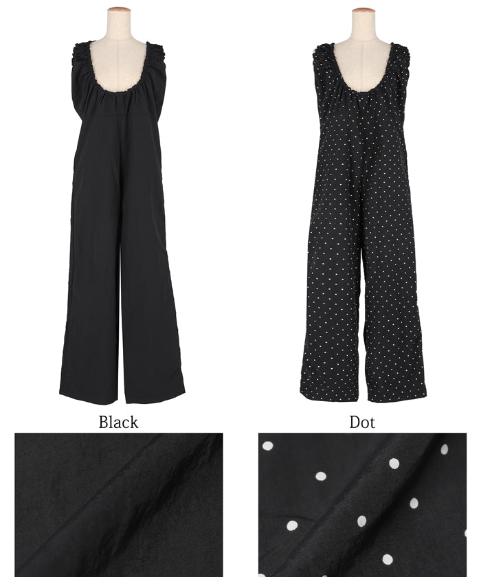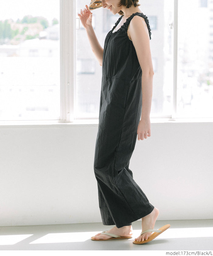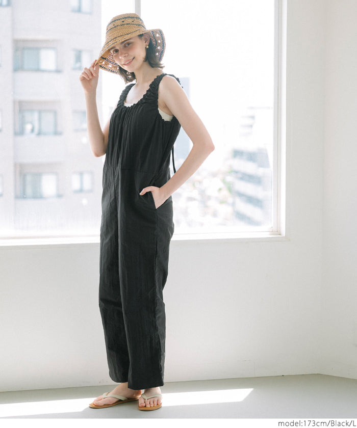 セール★2990円→1990円 ワッシャーナイロン肩ギャザーオールインワン レディース メール便不可